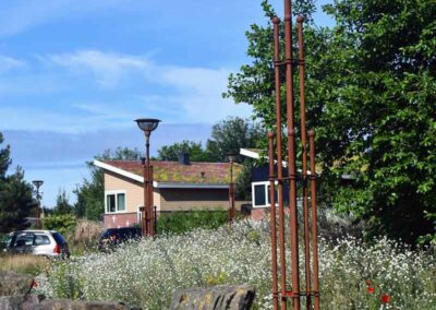 Het materiaal en de kleur van de objecten bieden een mooi contrast met de houten en stenen huizen van de wijk.[1]