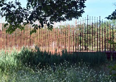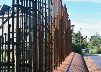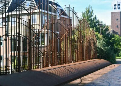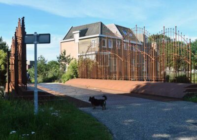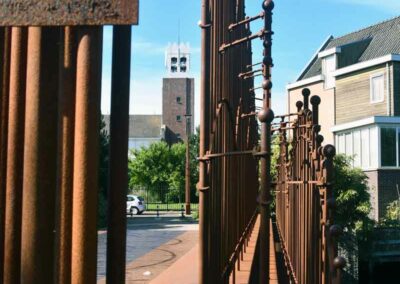Het materiaal en de kleur van de objecten bieden een mooi contrast met de houten en stenen huizen van de wijk.[1]