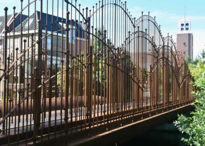 De brug kenmerkt zich aan de bruinstalen spijlen met hierop bollen. Deze spijlen zijn drie lagen dik.
