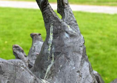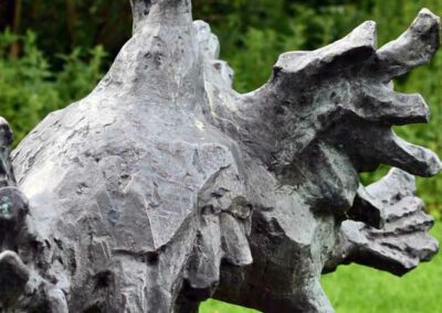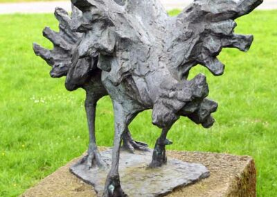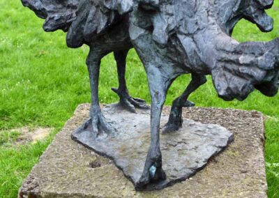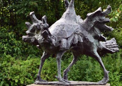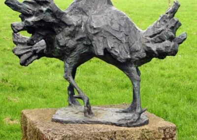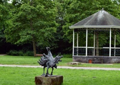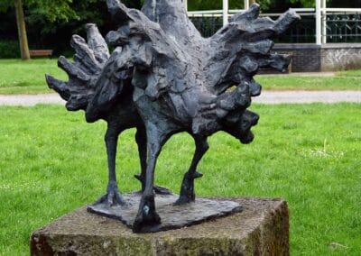 In het Timorpark op een hardstenen sokkel vind je twee vechtende kalkoenen. De dieren draaien om elkaar heen en bevinden zich in een levendig gevecht.